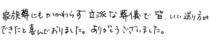 家族葬にもかかわらず立派な葬儀で皆いい送り方ができたと喜んでおりました。ありがとうございました。