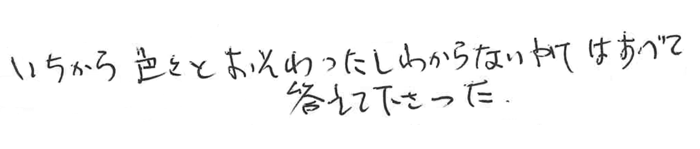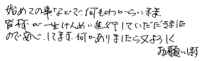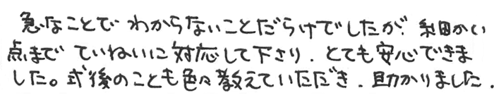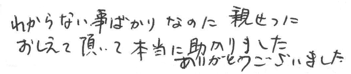 わからない事ばかりで不安でしたがすべてのことに答えていただき、本当に心配なく終わることができました。
