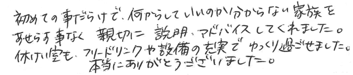 初めての事だらけで、何からしていいのか分からない家族をあせらす事なく親切に説明アドバイスしてくれました。休憩室もフリードリンクや設備の充実でゆっくり過ごせました。本当にありがとうございました。 2016.12 M家