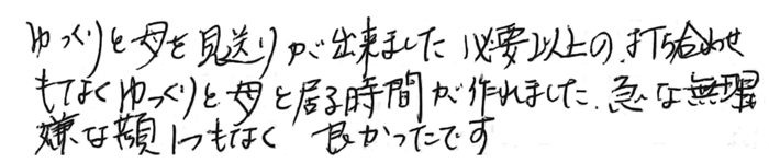 ゆっくりと母を見送りが出来ました。必要以上の打ち合わせもなくゆっくりと母と居る時間が作れました。急な無理も嫌な顔ひとつもなく良かったです。