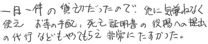 一日一件の貸切だったので、他に気兼ねなく使え お寺の手配、死亡証明書の役場への提出の代行などもやってもらえ非常にたすかった。 2016.12 F家