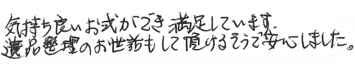 気持ち良いお式ができ満足しています。遺品整理のお世話もして頂けるそうで安心しました。
