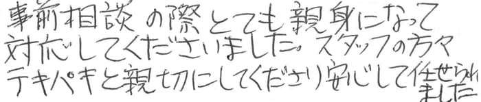 事前相談の際 とても親身になって対応してくださいました。スタッフの方々テキパキと親切にしてくださり安心して任せられました 2017.03 H家
