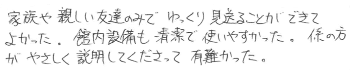 家族や親しい友だちのみでゆっくり見送ることができてよかった。館内設備も清潔で使いやすかった。係の方がやさしく説明してくださって有難かった。 2017.01 K家