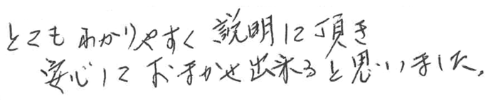 とてもわかりやすく説明して頂き安心しておまかせ出来ると思いました。 2017.01 K家