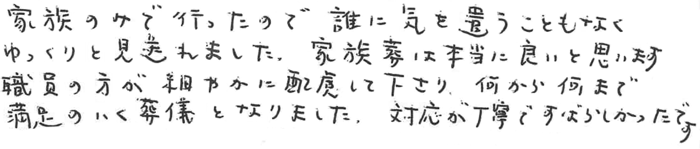 家族のみで行ったので、誰に気を遣うこともなくゆっくりと見送れました。家族葬は本当に良いと思います。職員の方が細やかに配慮して下さり何から何まで満足のいく葬儀となりました。対応が丁寧ですばらしかったです。 2016.10 K家