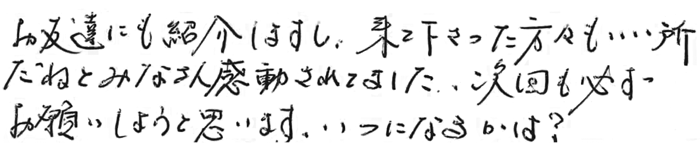 お友達にも紹介しますし、来て下さった方々もいい所だねとみなさん感動されてました。