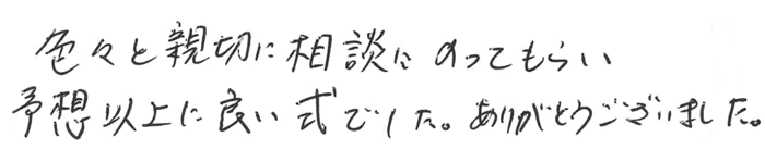 急なことでわからないことだらけでしたが、細かい点までていねいに対応して下さり、とても安心できました。式後のことも色々教えていただき、助かりました。 2017.03 I家